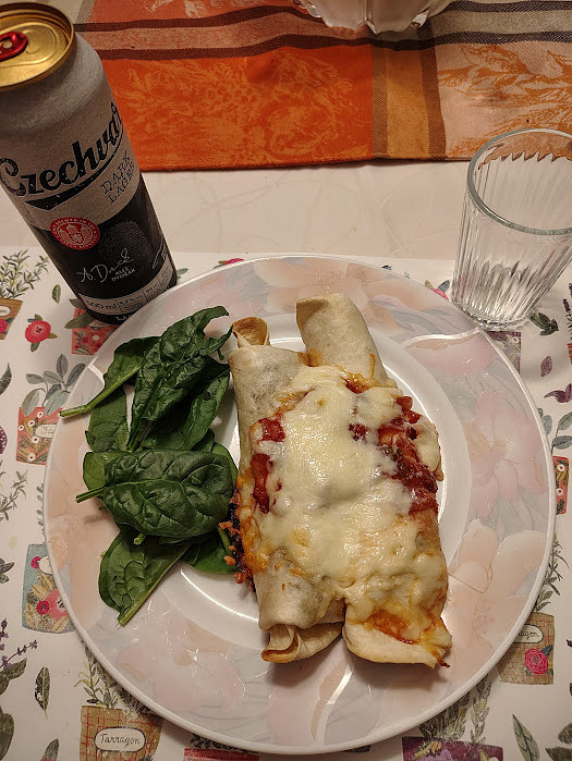 u nas dnes tortilas plnene hovezim masem, polite salsou a mozzarella syr a spenat.