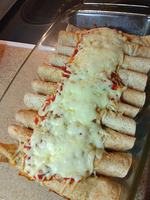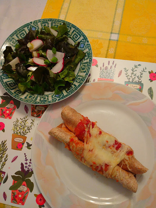 U nas enchiladas plnene hovezim mase a zapecene se salsou a mozzarella syrem, zeleny salat.