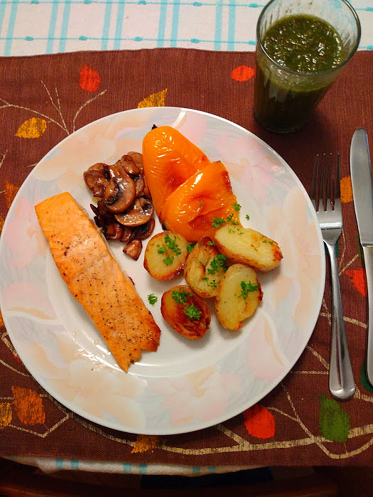 U nas dnes losos, brambory a grilovana paprika, spenatove smoothie. Desert je jeste makovec.