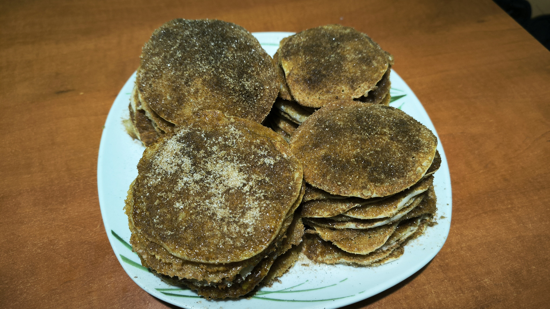 No a pak to přijde, na palačinkovač manžel leje a uhladí těsto, sestra peče a já potřu máslem a obalím v cukru se skořicí