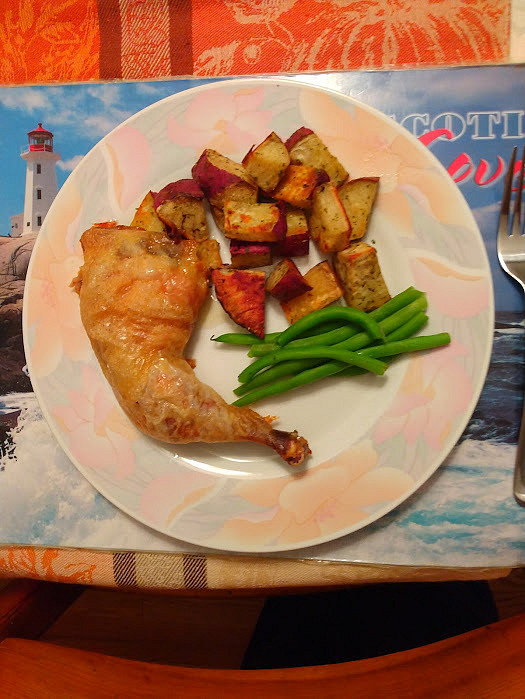U nas znovu kureci polevka, upecene kureci nohy a upecene v troube sladke brambory, okurkovy salat a spenatove smoothie.