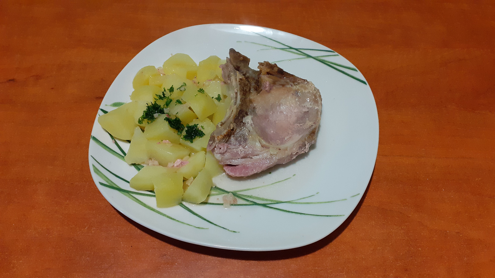 Dnes na oběd přišla dcera s rodinou. Upekla jsem vepřové kotlety s kostí na špeku, vařený brambor a okurkový salát
