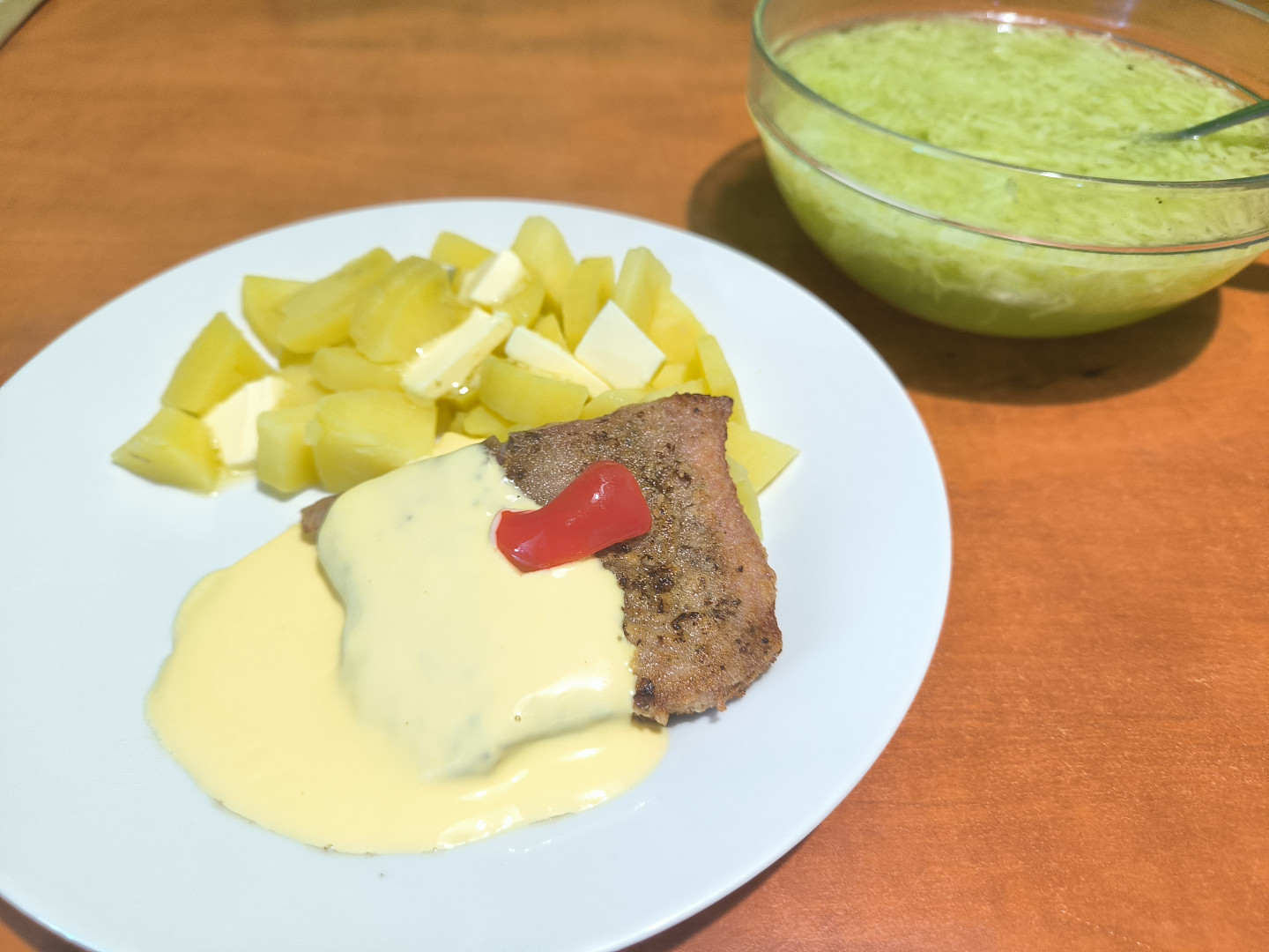 U nás dnes k obědu sumeček, vařený brambor s máslem a Holandskou omáčkou 😋. Jo a okurkový salát.😀