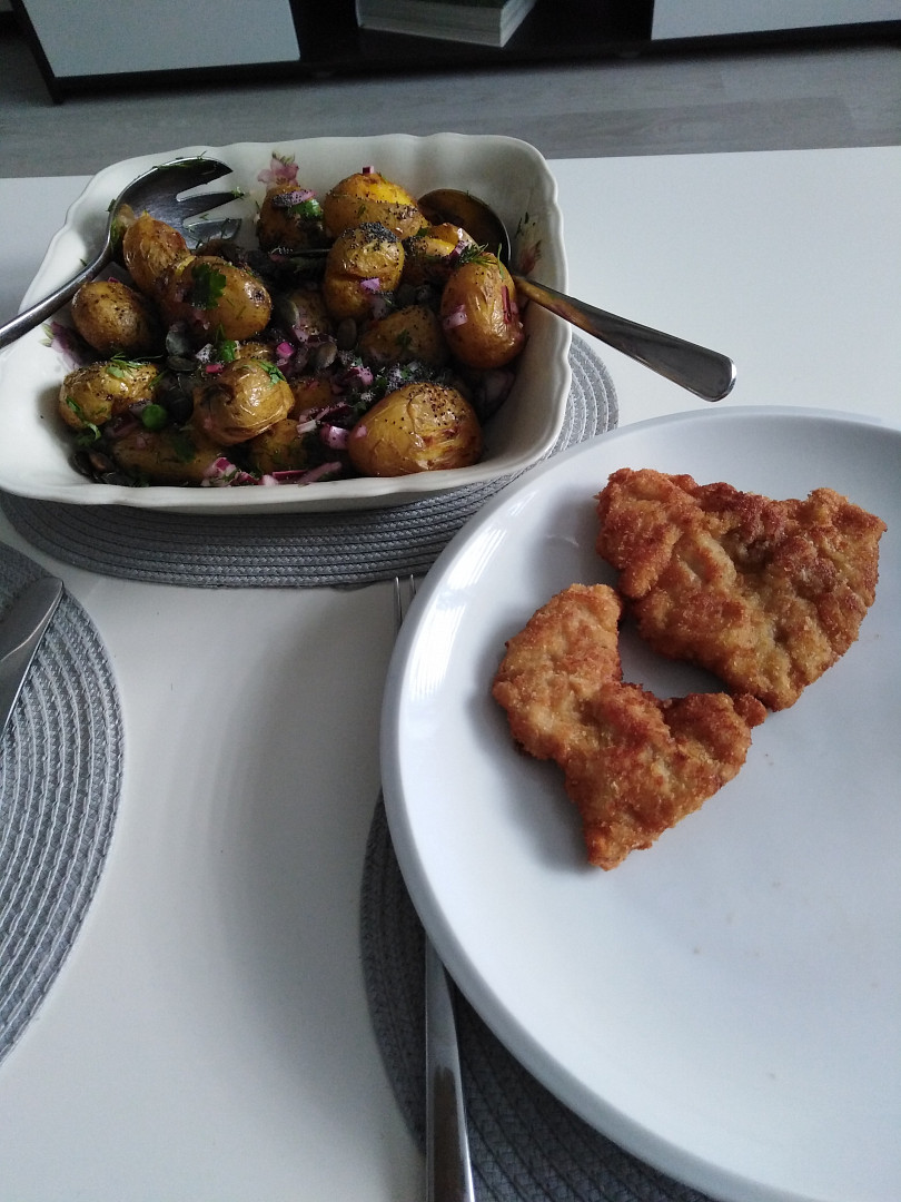 My jsme si dnes udělali "falešný Štědrý den". Jen polévka byla z včerejšího ovaru se zeleninou a nudlemi. Hlavní chod obalovaný kapr v horkovzdušné fritéze a rakouský bramborový salát bez majonézy.