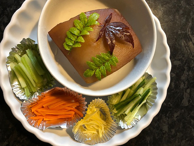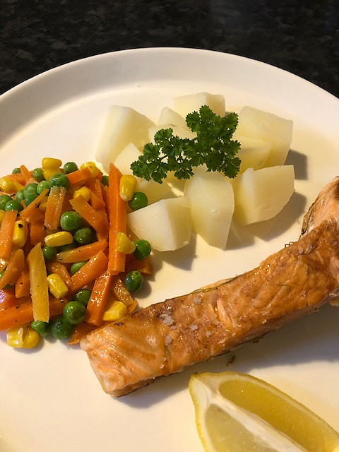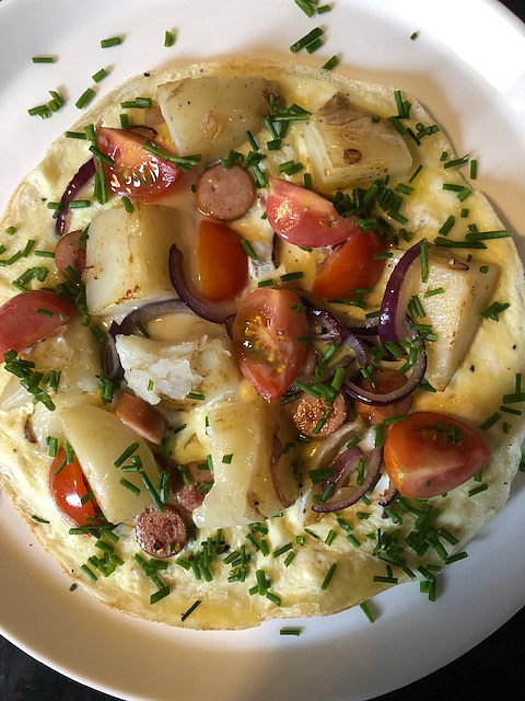 Selska omeleta, polevka cockove/fazolove/rajcatova, losos, marinovany bucek, veprove kousky s porkem.