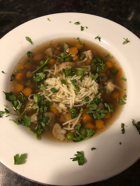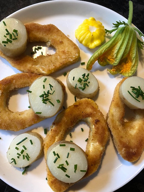 Pak smazeny patizon, polevka s kvasnicovymi knedlicky.