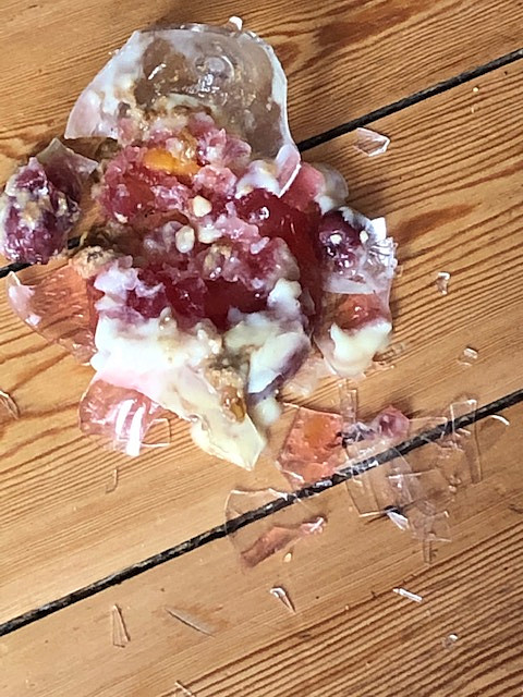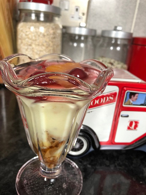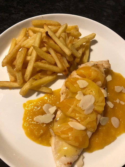 Bylo i retro - kureci prso s broskvema a hranolkama a puding s ovocem a galaretkou.