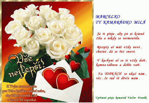 k dnešním narozeninám Ti přeji ze srdce vše nejlepší, hodně zdraví a štěstí, spokojenosti hlavně doma a taky v práci, pěkně si svůj narozeninový den oslav