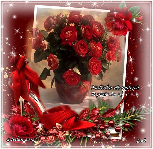 (Moje Milá Naďo), dovol mi v předvečer tvých narozenin popřát ti vše to nejlepší. Co bych ti měl přát. To nejdůležitější máš. Máš milující rodinu, máš spoustu přátel kteří tě mají rádi (doufám, že se mezi ně můžu počítat i já), jsi zdravá, máš veselou mysl a snad i trochu toho štěstíčka si k tobě našlo cestu. Takže AŤ TI TO VYDRŽÍ. Krásné narozeniny.