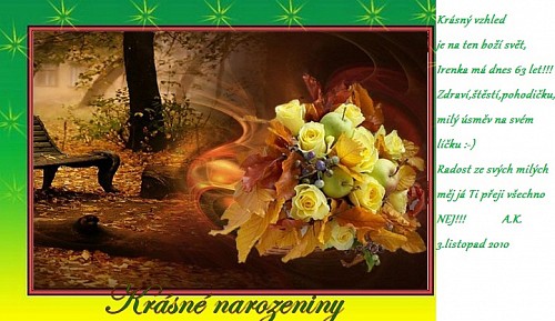 Irrenko,všechno nejlepší k Tvým narozeninám,hodně zdravíčka,štěstíčka,lásky a hlavně pohodičky Ti ze srdce přeji.