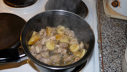 Krok 3: Přidáme zbytek mandarinky a banánu, produsíme cca 5 min. Půlku hermelínu nakrájíme na kostičky a přidáme k masu, necháme roztavit a vypneme plotýnku.