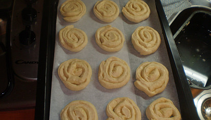 Krok 1: Po vykynutí vyválíme obdélník, potřeme rozpuštěným máslem. Svineme a nakrájíme na kolečka.