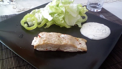 Americké brambory umyjeme, nasekáme na čtvrtky, položíme na plech (na plechu mějte papír na pečení) a posypeme kořením na americké brambory. Pečeme zhruba 40 minut na 220 °C (do trouby dáváme dříve než lososa!).