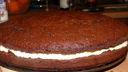 Krok 5: Vychladlý korpus rozřízneme, spodní část potřeme krémem a přiklopíme druhou částí korpusu. Vložíme zpět do dortové formy.