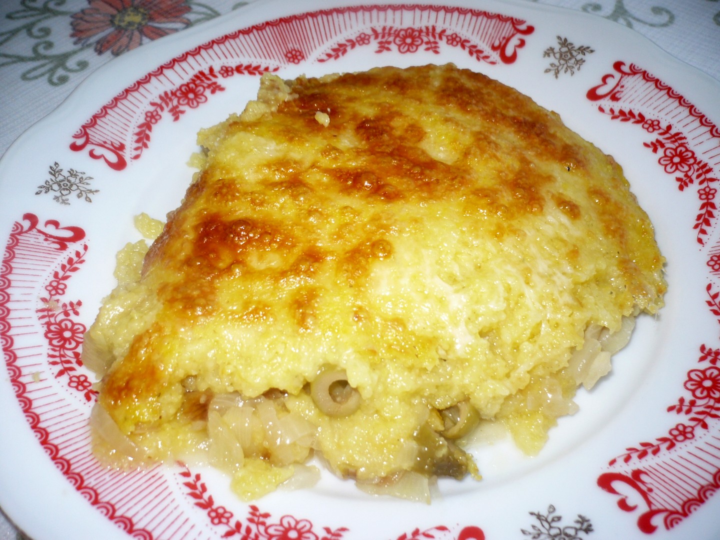 Krok 4: Polovicu kaše dáme do vymasteného pekáčika, polejeme slaninou s cibuľou, posypeme narezanými olivami a zakryjeme druhou polovicou kaše.
