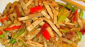 Krok 1: Šmakoun nakrájíme na jemné nudličky a dáme do misky. Zalijeme sójovou omáčkou, worcesterem, přidáme koření na čínu, promícháme a necháme chvíli odstát. Krok 2: Mezitím v míse zalijeme čínské nudle horkou vodou se solí a necháme stát asi 3 minuty (musí být ponořené). Pak je přelijeme přes cedník a necháme řádně okapat. Krok 3: V hluboké pánvi (wok) rozehřejeme olej, vložíme nudličky šmakounu a jemně opečeme. Pak je vyjmeme a uložíme do tepla. Do oleje vložíme na nudličky nakrájený zázvor, pokrájenou cibuli, lehce osmahneme, přidáme nakrájenou papriku, pórek, promícháme a vložíme zpět šmakoun. Krok 4: Pak přidáme okapané nudle a vše chvíli osmahneme. Po asi 2 minutách podlijeme vývarem a jemně zahustíme solamylem. Dle potřeby ochutíme solí, sojovou omáčkou.