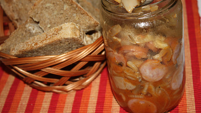 Krok 3: Pak rovnáme vrstvy - párek, cibule a nálev s hlívou.