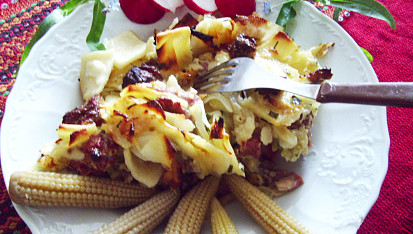 Domácí fleky zapečené s mletým masem, nivou a kapustou