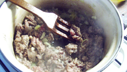 Krok 2: Na pánvi rozehřejeme sádlo a osmažíme nakrájenou cibuli a česnek nasekaný na kousky. Přidáme mleté maso, občas promícháme a dusíme.