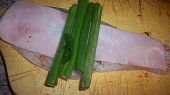 Krok 2: Na každý plátek dáme několik lístků libečku, plátek šunky a kousky zelené cibulky.
