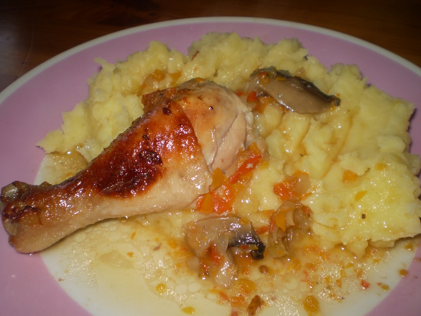 Krok 1: Kuřecí dílky osolíme, posypeme troškou mletého zázvoru. Přidáme na plátky nakrájenou cibuli a žampiony, proložíme bobkovým listem a přidáme pár lžic čalamády.