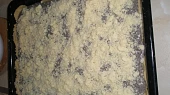 Krok 3: Pokud je náplň moc tekutá, zahustíme ji podle potřeby rozdrcenými piškoty nebo hrstí strouhanky. Takto připravenou směs rovnoměrně naneseme na vyválené těsto a vrch koláče zasypeme drobenkou udělanou z množství dle rozpisu.