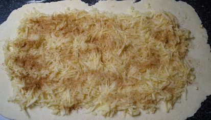 Krok 2: Jablka nastrouháme nahrubo nebo nakrájíme na kostky a rozprostřeme na těsto. Posypeme skořicí, rozinkami a mletými ořechy dle chuti.