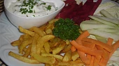 Krok 5: Na talíř položím salátový list a na něj rozložím proužky zeleniny a hranolky. Mističku s dipem postavím vedle talíře.