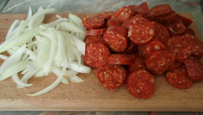 Krok 4: Následně ve výpeku orestujeme proužky cibule a na jemné plátky nakrájenou čabajskou klobásu, kterou prsa posypeme. Podáváme s bramborovou kaší.