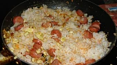 Krok 2: Na velké lžíci másla uděláme míchaná vajíčka, přidáme párky cca 5 min. Potom přidáme vařenou rýži dokud se neslepí. Poté servírujeme.