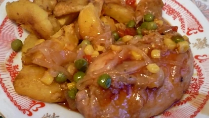 Krok 3: Když maso začne zlátnout, přisypeme mraženou zeleninu a vrátíme do trouby.