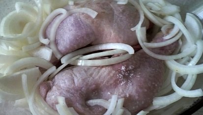 Krok 1: Kuře naporcujeme, mírně osolíme a společně s nakrájenou cibulí dáme péct.