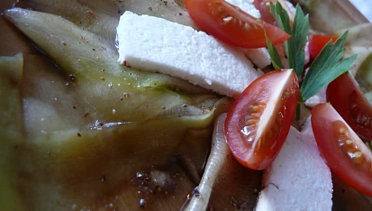 Krok 3: Po rozležení naaranžovat na talíř, znovu posypat hrubě mletým pepřem, lehce zakapat balsamikem, přidat pokrájený sýr a na dozdobení rajče a nějaký kousek zelené bylinky.