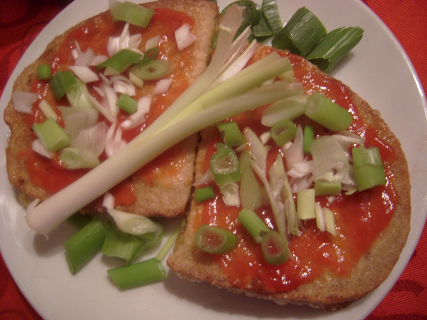 Krok 2: Opečené půlky chleba vyjmeme z oleje, pomažeme kečupem a posypeme nakrájenou cibulkou. Dobrou chuť.