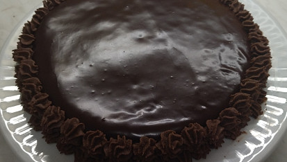 Krok 16: Dort dáme na větší kousek pečicího papíru a poléváme, když je čokoláda trochu zchladlá (je celkem hustá, ale dobře se po dortu i jeho bocích rozteče, nemusí se ničím roztírat).