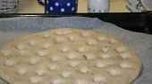 Krok 4: Poté do placky uděláme prsty hluboké důlky a necháme kynout ještě další půl hodiny.