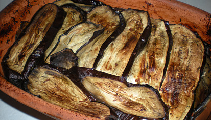 Krok 4: Zapékací misku nebo předem namočený římský hrnec zlehka vytřeme troškou oleje a dno a stěny misky vyložíme asi 2/3 plátků lilku, na které průběžně roztíráme směs česneku a olivového oleje (trochu si necháme i na závěrečnou vrstvu).