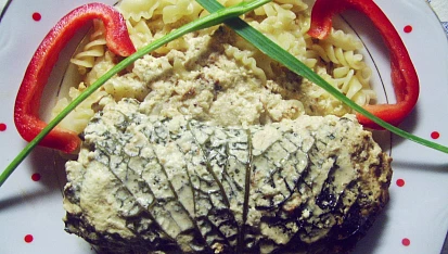 Krok 2: Připravíme si náplň : maso dáme do misky a zalijeme trošku vodou, osolíme, opepříme, necháme chvíli odpočinout a přidáme dál hořčici, kečup, oregano, provensálské bylinky, koření na mleté maso, prolisovaný česnek, 1 vejce, strouhaný sýr, nadrobno nakrájenou kapii, všechno promícháme a přidáme strouhanku a sůl jak třeba, aby nám vznikla pevná hmota.