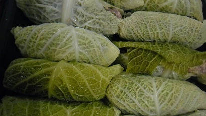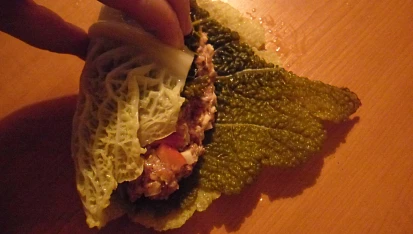 Krok 1: Kapustové listy ponoříme do vařící vody, chvilinku je necháme vařit, pak je vyndáme a necháme okapat.