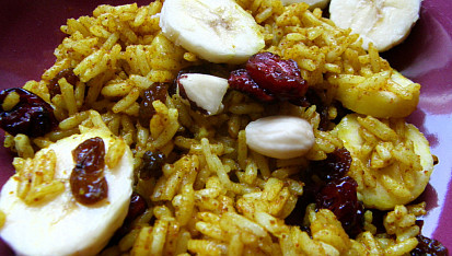 Krok 3: Promícháme, přisypeme rýži a ještě promícháme, aby se rýže obarvila kari kořením.