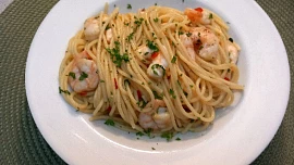 špagety s krevetami na česneku,