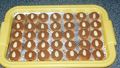 Plech vyložíme papírem na pečení. Krok 2: Arašídy jemně umeleme a z uvedených surovin zpracujeme těsto, které necháme v ledničce odpočinout. Krok 3: Poté vyválíme plát malinko silnější, než jako na linecké. Vykrajujeme kolečka. Klademe na pečicí papír a upečeme ve vyhřáté troubě na 175 °C dorůžova. Krok 4: Po dvou slepujeme rybízovou marmeládou, nebo Nutellou. Vrch potřeme nebo postříkáme čokoládou a zdobíme podle uvážení - půlkou mandle, půlkou arašídového oříšku, barevným posypem, čokoládovou rýží.
