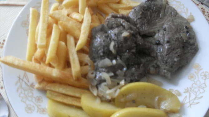 Krok 3: V pánvi na oleji jsem zesklovatěla cibuli, dala plátky kýty a podusila asi 2o min.