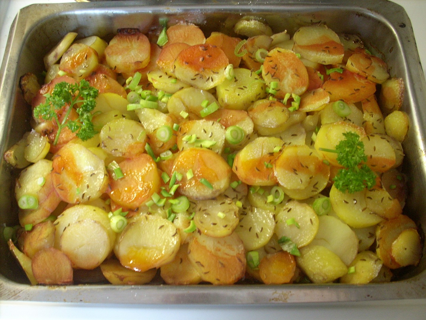 Krok 2: Na vymazaný plech klademe řízky, posypeme česnekovými a cibulovými plátky a celé pokryjeme brambory, které jsme nakrájeli také na plátky, pokmínovali a osolili.