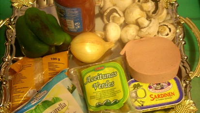 droždí, cukr, voda, mouka polohrubá, protlak rajčatový, salám měkký, bazalka čerstvá, žampióny, cibule, paprika čerstvá zelená, olivy černé, sardinky, sýr mozzarella, parmazán