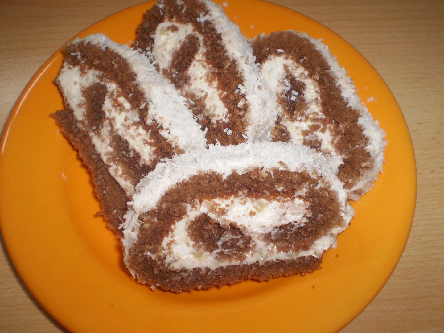 Krok 3: V misce rozmačkáme banány, přidáme 2 tvarohy, vanilkový cukr a cukr moučku, kdo má rád sladší. Vše smícháme a namažeme na vychladlou roládu. Potřeme krémem i po povrchu a posypeme kokosem nebo strouhanou čokoládou, či mandlovými plátky. Dáme do lednice vychladit.