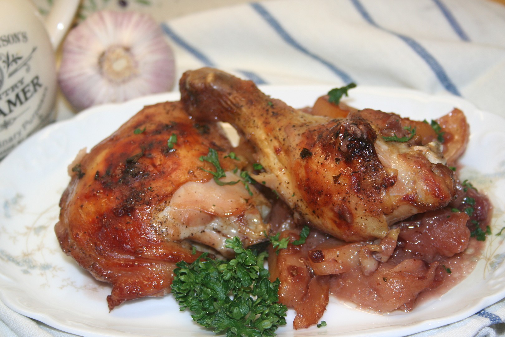 Krok 3: Porce kuřete v pekáčku obložíme kousky jablek, na která rozprostřeme brusinky (já mám nejraději brusinkovou směs z Ikea).