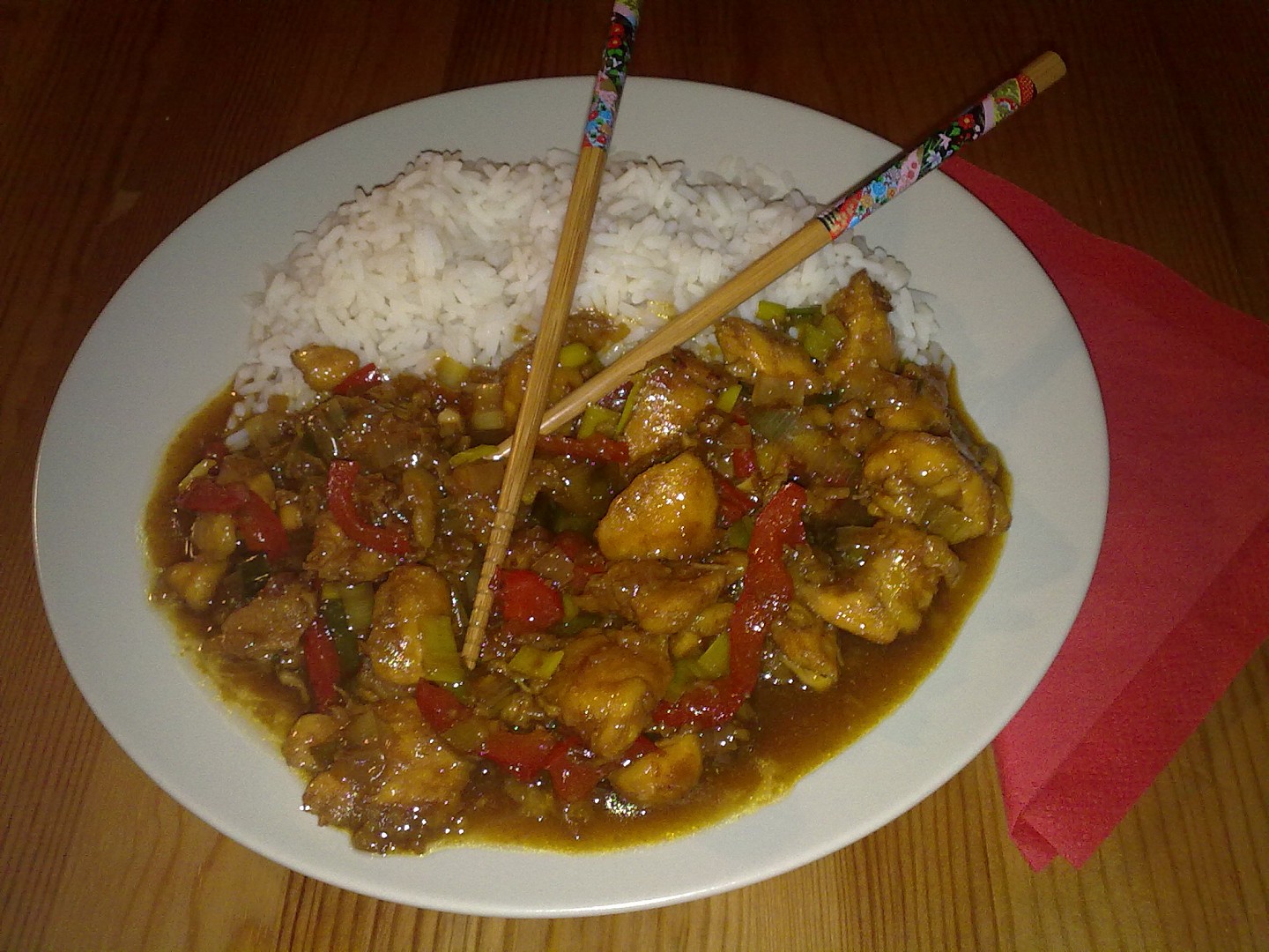 Podáváme s vařenou rýží. Místo příboru použijeme hůlky.