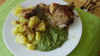 Krok 3: Zustatek "koule" pak dame na plech ke kureti a ke kurecim palickam a vse posypeme kminem, soli , cibuli, dal pak jiz peceme na plechu s maslem, olejem a podlevame (muze se i pivem, kdyz nejedi deti). Jako prilohu jsem si podavala i zmrazeny spenat se smetanou a brambory. Doba pripravy a peceni asi 1 a pul hodiny, cena cca 150 kc a porci asi tak myslim bude 8.