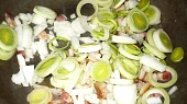 Krok 1: Nejprv sem oloupala brambory, nakrájela je na malý kousky a dala do vody uvařit. Pak sem si nakrájela pórek a cibulku, na pánev sem si dala máslo na pečení a nechala ho roztát, pak sem tam dala pórek a cibulku a osmažila trošku.